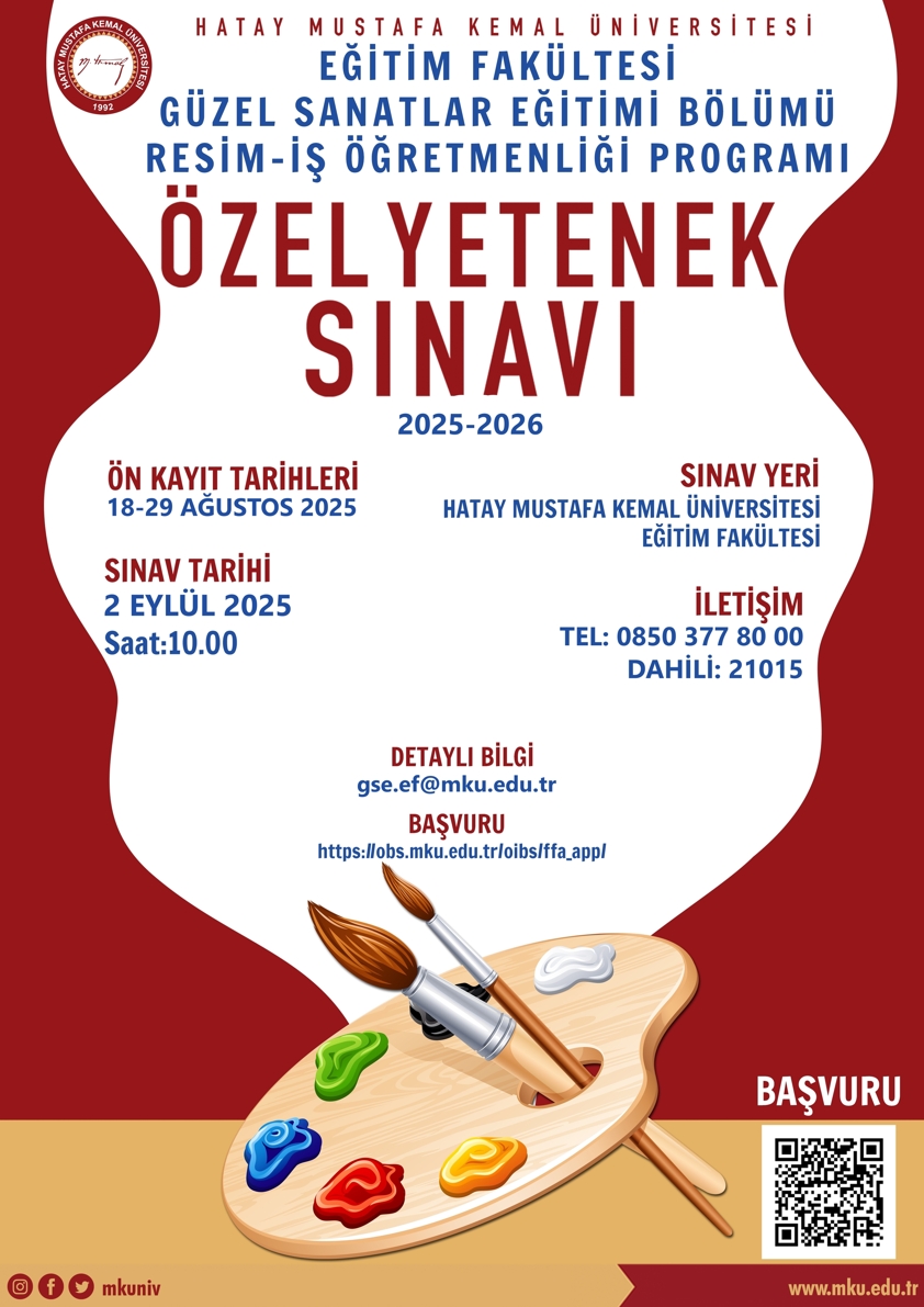 2025-2026 Eğitim-Öğretim Yılı Eğitim Fakültesi Güzel Sanatlar Eğitimi Bölümü Resim İş Eğitimi Programı kapsamında gerçekleştirilecek olan ‘Özel Yetenek Sınavı’ başvuru süreci 18-29 Ağustos 2025 tarihinde başlayacaktır. Sınav takvimi, başvuru koşulları, gerekli belgeler ve diğer tüm detaylı bilgilere aşağıdaki linki tıklayarak ulaşabilirsiniz.