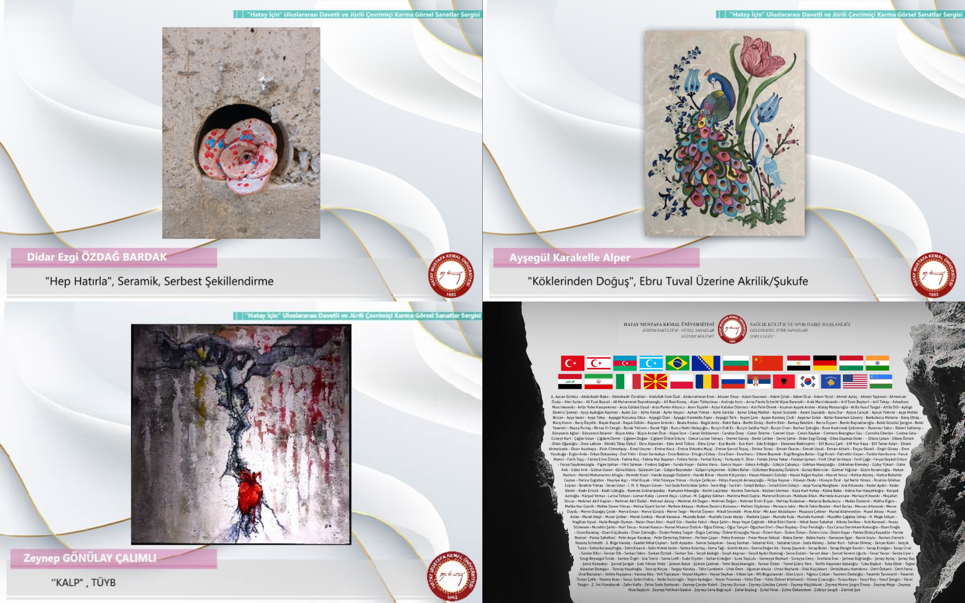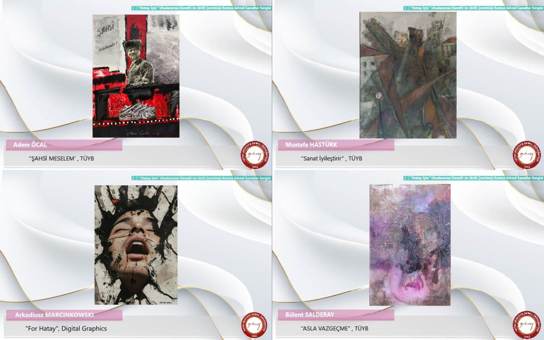 Hatay Mustafa Kemal Üniversitesi Güzel Sanatlar Eğitimi Bölümü ve Geleneksel Türk Sanatları Topluluğu tarafından, asrın felaketinin ikinci yıldönümünde yaşanan acıları sanatın evrensel diliyle ifade edebilmek amacıyla düzenlenen “HATAY İÇİN” isimli uluslararası davetli ve jürili çevrimiçi bir karma görsel sanatlar sergisi, 6 Şubat 2025 saat 16:17’de çevrimiçi ortamda görsel sanatlar alanının duayenlerinin katılımlarıyla gerçekleştirildi. Serginin açılış toplantısı akademisyenler, sanatçılar, öğrenciler ve sanatseverler tarafından büyük bir ilgiyle karşılandı. Yoğun bir katılımın olduğu sergide, görsel sanatlar alanının farklı disiplinlerinden; resim, fotoğraf, özgün baskı, grafik, heykel, seramik ve geleneksel Türk sanatları, vb. alanlardan toplamda 25 farklı ülkeden 475 sanatçı eserleriyle birlikte yer aldı.