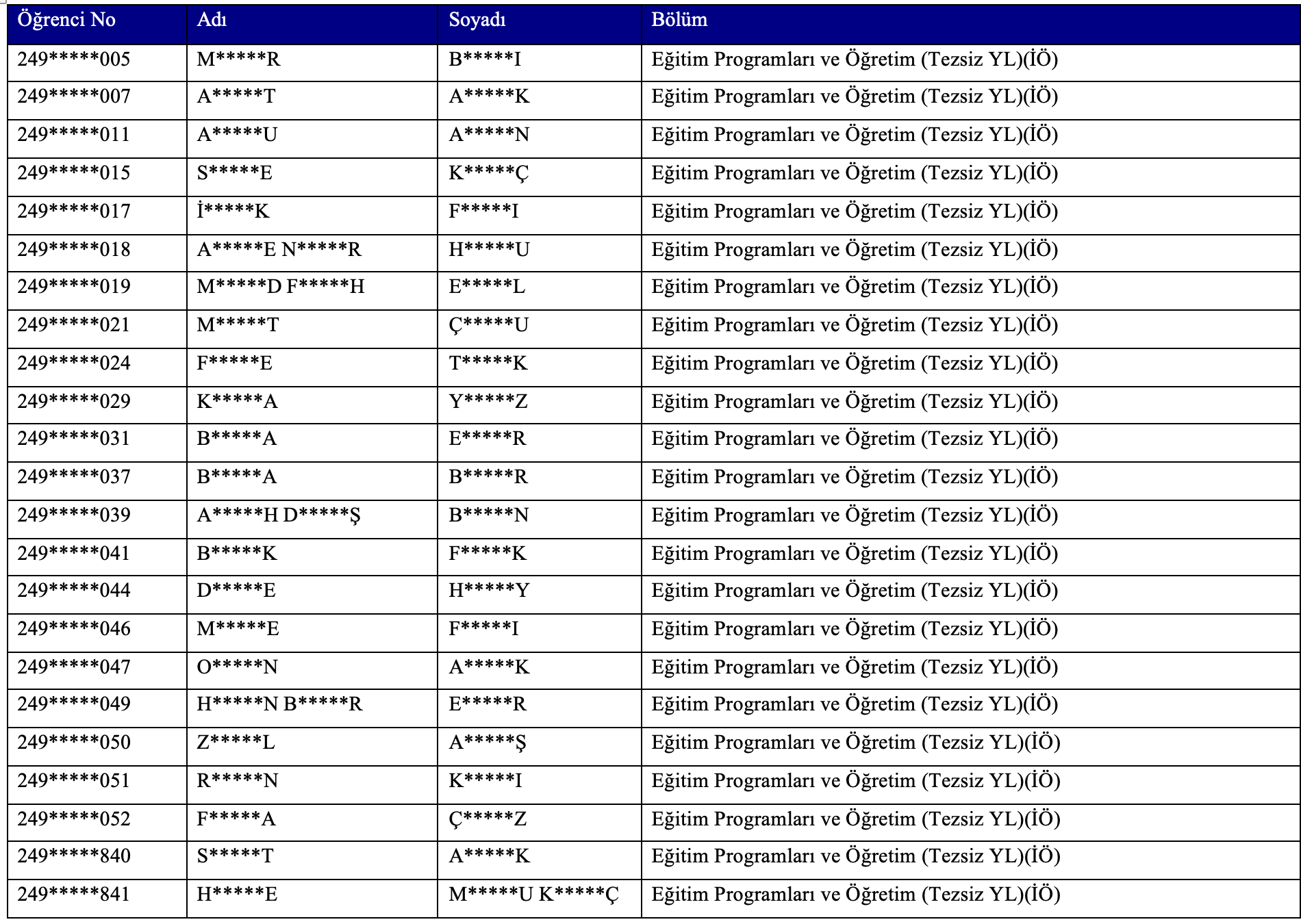 Eğitim Programları & Öğretim Ana Bilim Dalı (Tezsiz YL - İÖ) öğrenci dosyalarında yapılan inceleme sonucunda, ilgili programlarda kayıtlı olan, azami öğrenim sürelerini dolduran ve bu süre içerisinde başarılı olamayan ve/veya kayıt yenilemeyen aşağıda adı, soyadı ve numarası belirtilen öğrencilerin Hatay Mustafa Kemal Üniversitesi Lisansüstü Eğitim ve Öğretim Yönetmeliği’nin 33. maddesinin 1. fıkrası gereğince kayıtlarının silinmesine karar verilmiştir.